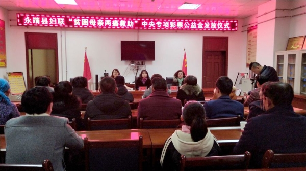 1月17日,永靖县妇联举行全国妇联“贫困母亲两癌救助”中央专项彩票公益金发放仪式。县委常委、妇联主席何珺出席仪式并讲话,县妇联全体干部职工,15名受助贫困妇女及家属参加发放仪式。