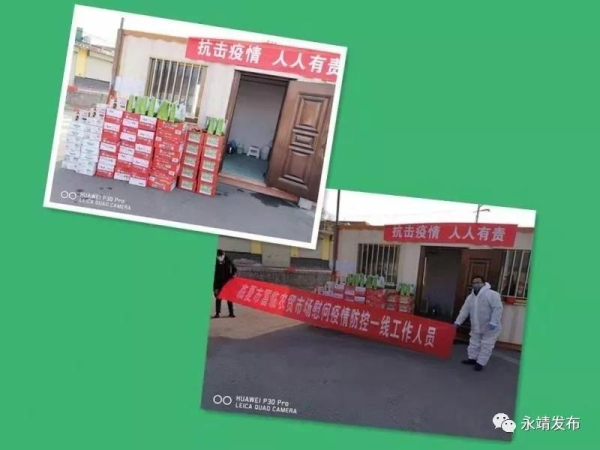 然而,疫情防控工作人员却牵动着社会各界的心,2月2日上午,临夏州市场监管局、交通局、临夏市市场监管局牵头,临夏市福临农副产品批发市场向奋战在疫情防控一线的祁家渡口检测点工作人员送去了他们的一片爱心。方便面、牛奶、苹果、梨、茶叶、热宝......这些慰问品给祁家渡口监测点的工作人员带来了寒冬的温暖、增添了他们严防死守的决心。