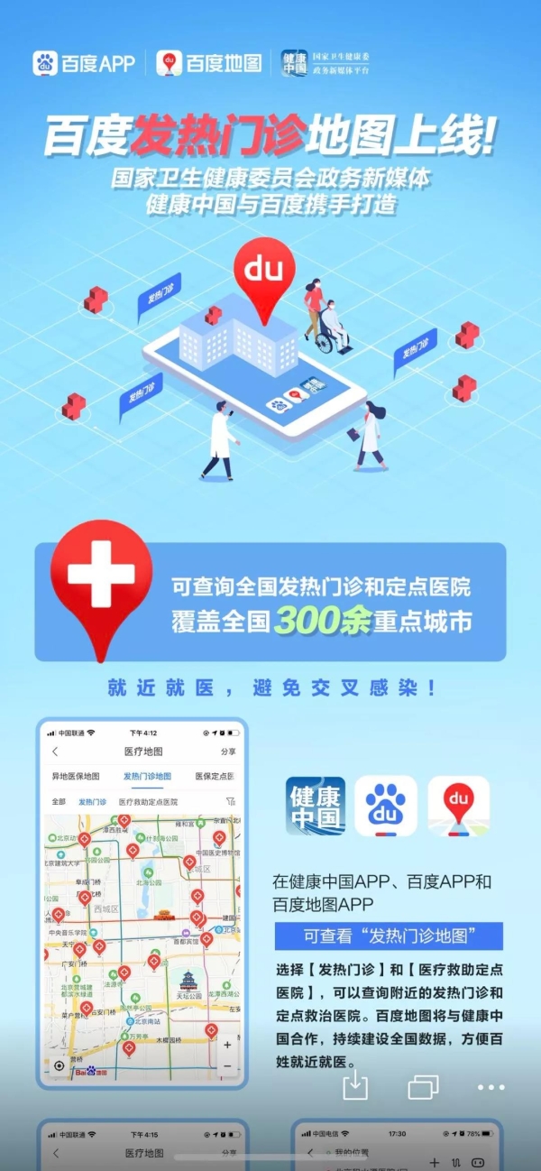 近期,新型冠状病毒感染的肺炎疫情牵动人心。面对突发疫情,国家卫生健康委员会政务新媒体平台健康中国与百度地图携手合作,紧急上线“发热门诊地图”,公众可通过健康中国客户端,或百度地图,一键查看全国的发热门诊及医疗救治定点医院。相关发热门诊数据和定点医疗机构数据持续更新中。