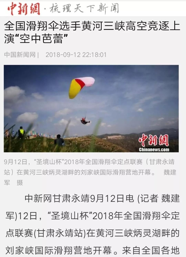 9月12日至13日,备受关注的“圣境山杯”2018年全国滑翔伞定点联赛(甘肃永靖站)在永靖黄河三峡炳灵湖畔的刘家峡国际滑翔营地举行,来自湖北、四川、河南、浙江、广西、甘肃等省区的40名滑翔伞高手精彩绝伦的天空竞逐表演,得到了中央电视台、新华社、腾讯等在内的中央、省、州40余家主流媒体的广泛关注,并在其媒体主要时段和主要版面刊发、转载赛事图文消息,视听甘肃、掌上兰州、中国临夏网等15家新媒体还进行了现场云直播,关注人数近100万人次。