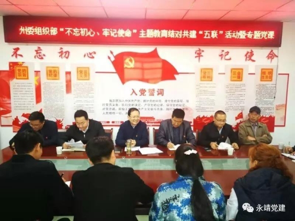 10月11日上午,州委常委、组织部部长黄宝树到陈井镇张家沟村开展“不忘初心、牢记使命”主题教育结对共建“五联”活动并作专题党课。会上,传达学习了习近平总书记在庆祝中华人民共和国成立70周年大会上的讲话和州委脱贫攻坚推进会精神。黄宝树围绕从党的历史中回顾初心和使命、从农村的发展变化中体会党的初心和使命、在服务群众中践行初心和使命三个方面作了深入浅出的辅导,教育引导农民党员当好党的政策的宣传员、矛盾纠纷的调解员、带头致富的领航员、文明新风的引导员。随后,现场查看了百合冷库建设和合作社运行情况,听取了驻村帮扶工作和脱贫验收准备情况汇报,提出了具体要求。