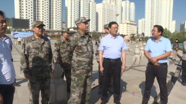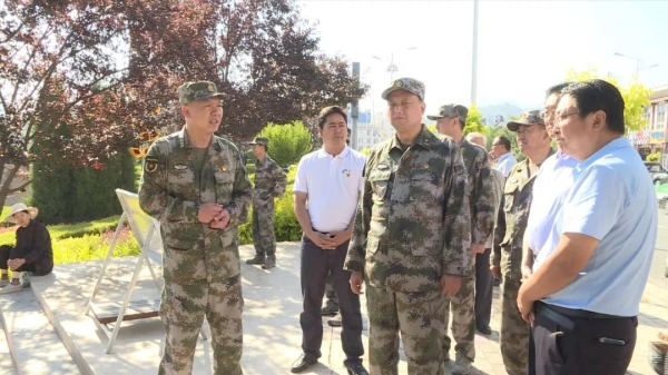 7月4日,省军区司令员王文清少将来永靖县检查指导防汛工作。州委常委、政法委书记魏贺生,州军分区司令员曹世龙,县委副书记马国全,县委常委、人武部部长韩国明陪同。