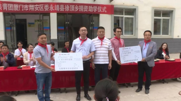 考察团一行先后来到徐顶乡大干沟中心小学、关山乡百合小院、新寺乡王年沟小学、刘家峡扶贫产业孵化园、三塬现代农业综合示范园区、刘家峡国际滑翔营地和县鹭岛青少年活动中心,考察了解永靖县教育教学、产业培育、文化旅游及厦门援建项目实施运行等有关工作。 在大干沟中心小学,考察团向全体学生捐赠了校服和学习用品,并向25名贫困学生每人捐助了1200元的助学金。受助学生纷纷向爱心人士表示感谢。 大干沟中心小学学生柳悦:“感谢厦门市的叔叔阿姨给我们带来了温暖,以后我会努力学习,用优异的成绩来回报叔叔阿姨,带来的这份爱心。” 大干沟中心小学学生王佳婧:“我一定会用优异的成绩,来报答你们对我的关心和帮助。” 考察团表示,将向大干沟中心小学和王年沟小学捐助电脑等教学办公设备,改善学校办学条件。 考察期间,共青团厦门翔安区委与共青团永靖县委签订了合作框架协议。考察团部分企业家还与三塬现代农业综合示范园区负责人就特色果蔬种植达成了初步合作意向。(记者:褚宗仁)