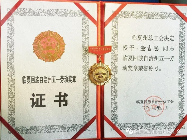 5月16日晚,州总工会召开党组会议,研究决定授予董吉恩同志为“临夏州五一劳动奖章”获得者,并按照有关程序,申报“甘肃省五一劳动奖章”。