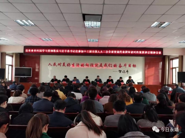 3月7日,习近平总书记在参加十三届全国人大二次会议甘肃代表团审议时发表了重要讲话,让永靖县广大干部群众倍感振奋,更添信心和干劲。3月8日上午,县委常委会召开扩大会议,专题传达学习习近平总书记在参加甘肃省代表团审议时的重要讲话精神,安排部署学习贯彻落实工作。3月11日上午,县委理论学习中心组召开专题学习会议,全文传达学习习近平总书记在参加十三届全国人大二次会议甘肃代表团审议时的重要讲话,再次安排部署学习贯彻落实工作。连日来,永靖县直各单位和各乡镇迅速掀起了学习习近平总书记重要讲话精神的热潮。