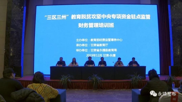 12月10日,教育部经费监管事务中心“三区三州”教育脱贫攻坚中央专项资金驻点监管财务管理培训班在永靖县开班,来自全省各市州教育系统的200多名财务项目管理人员参加培训班。副县长何永芳出席开班仪式并致辞。