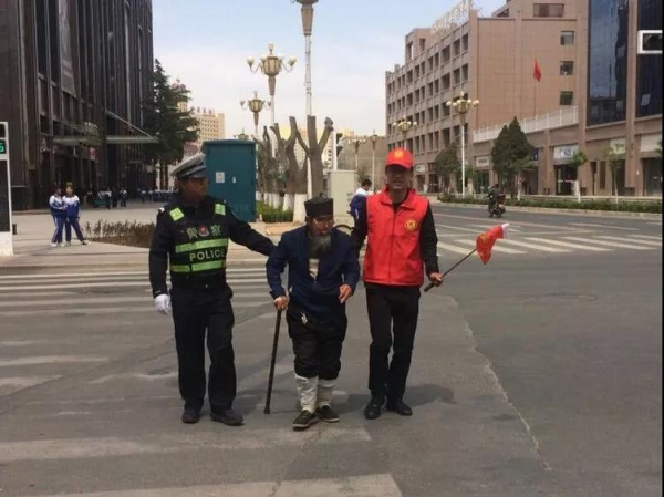 在县城重点什字路口,各志愿者、公安交警按照红绿灯指示,有序引导行人过马路