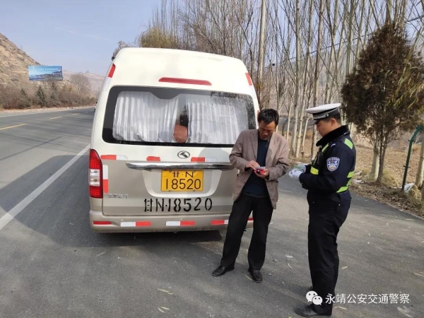 为深刻汲取兰州市“11.3”重大道路交通事故教训,全面贯彻落实省州冬季道路交通事故大战100天专项行动视频会议精神,永靖县公安局交警大队高度重视,认真组织,突出重点,科学勤务,强化辖区道路管控力度,分别在国道213线、城区主要道路严查无牌无证、超员超载、农用车违法载人、报废车辆上路等严重违法行为,确保辖区道路秩序平稳向好,有效预防和减少道路交通事故的发生。
