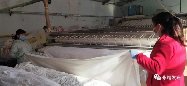 在新冠肺炎疫情防控期间,永靖县交通局、卫健局联系协调永靖县涤洁家政服务有限责任公司,充分利用企业自身优势,免费清洗消毒500套防护服,并为县蓝易扶贫车间生产的14000个纱布口罩进行了消毒处理。(记者:李树鹏)