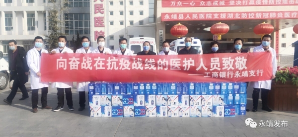 2月18日,工商银行永靖县支行向连日来奋战在我县防疫一线的医务工作者捐赠了价值10000元的物资。