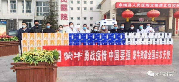 8日,蒙牛乳业集团携手永靖县华佳商贸有限责任公司,向永靖县医疗系统防疫一线工作人员捐赠了1272件、价值53000元的牛奶制品。