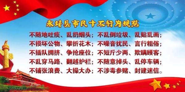 为全面提升城市文明指数,展现永靖文明新风,切实保障全县广大市民的生命安全和家庭幸福,县委、县政府决定在4月20日至5月20日开展以诚信体系建设、文明交通整治、城市管理综合整治、文明素质提升为重点的全国文明城市创建月活动,在此我们倡议: