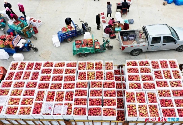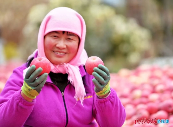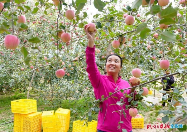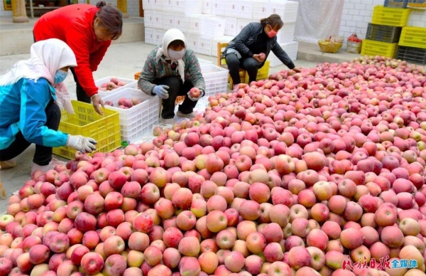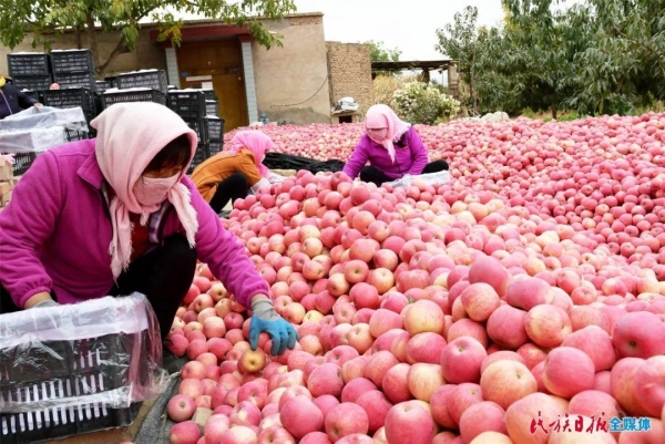 10月26日,永靖县岘塬镇果农在果园分拣采摘苹果。近年来,永靖县不断调整优化农业产业种植结构,利用“企业+合作社+农户”的发展模式,打造以苹果为代表的特色林果产业,帮助村民脱贫致富。目前,该县果园面积2万多亩,年产果品3500万公斤,产品销往四川、青海、陕西、福建等省区。